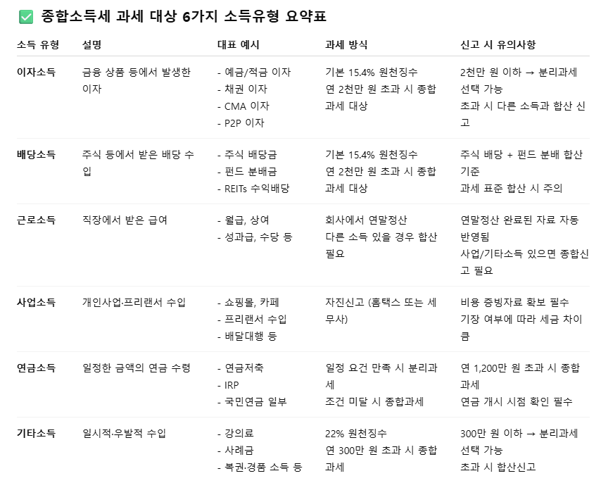 사업소득 외에도 이자·배당·근로소득 등 다양한 소득이 있는 경우, 모두 합쳐서 신고해야 합니다.